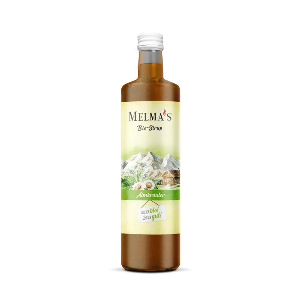 - 2-3 Pumper (für 0,25L) | 4-6 Pumper (für 0,5L) Melma's Bio-Sirup Almkräuter innen am Flaschenhals einlaufen lassen